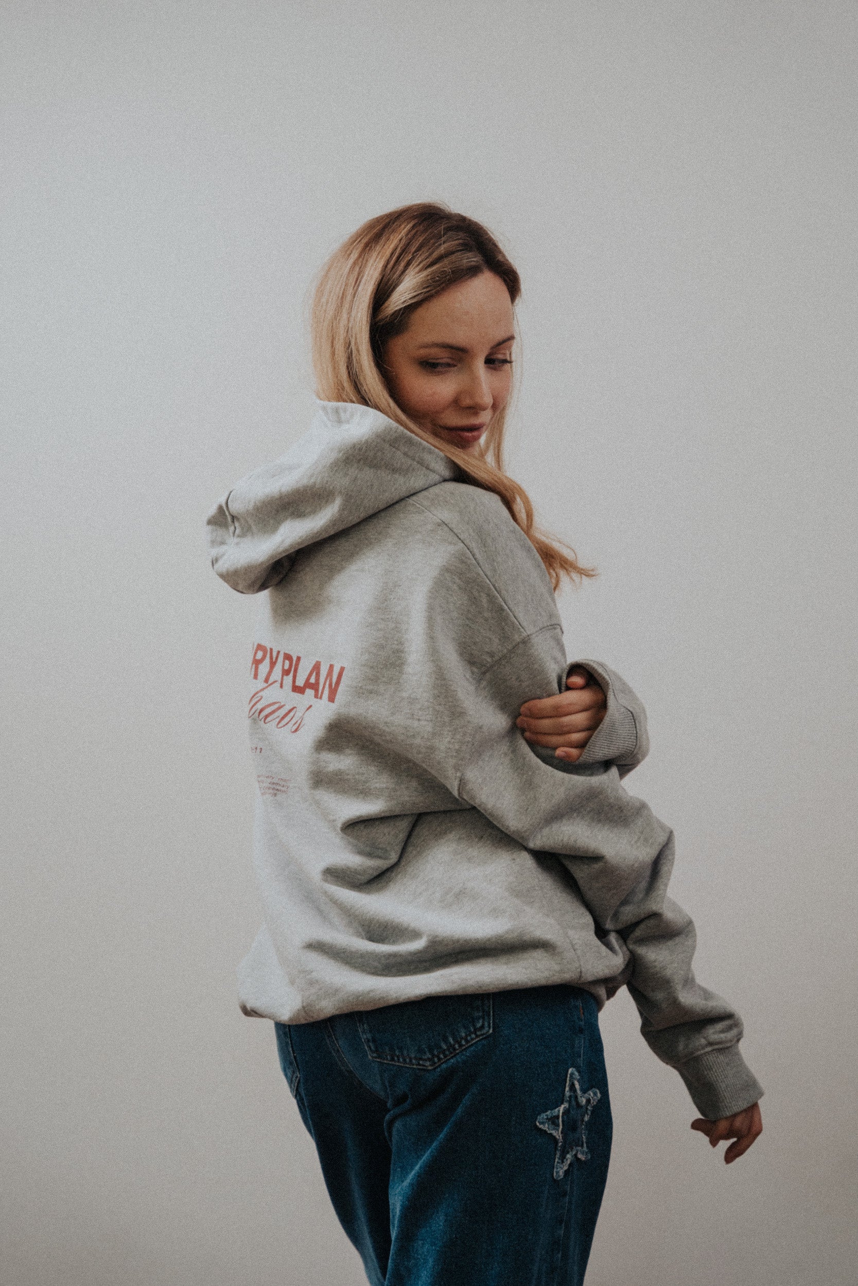 Soft, grey organic cotton. Loose fit with dropped shoulders. Small print on front. Larger message on back.