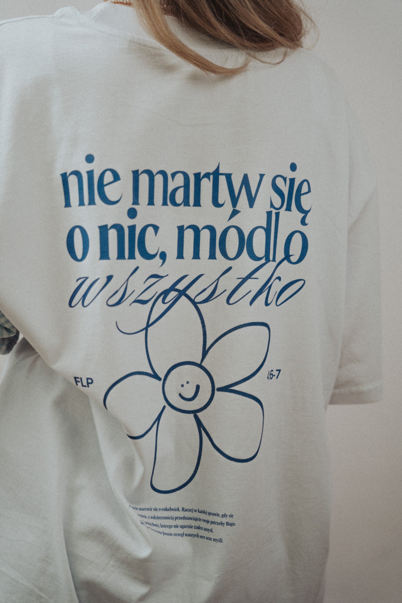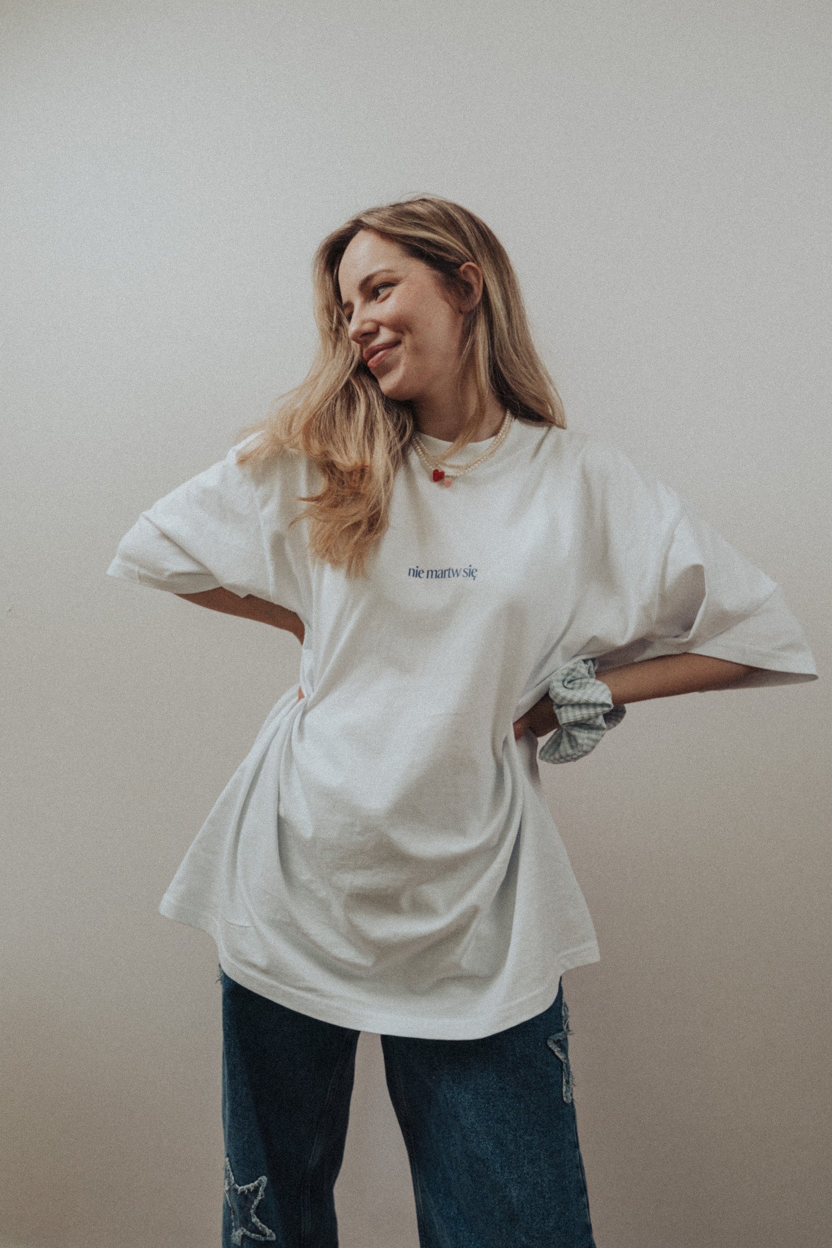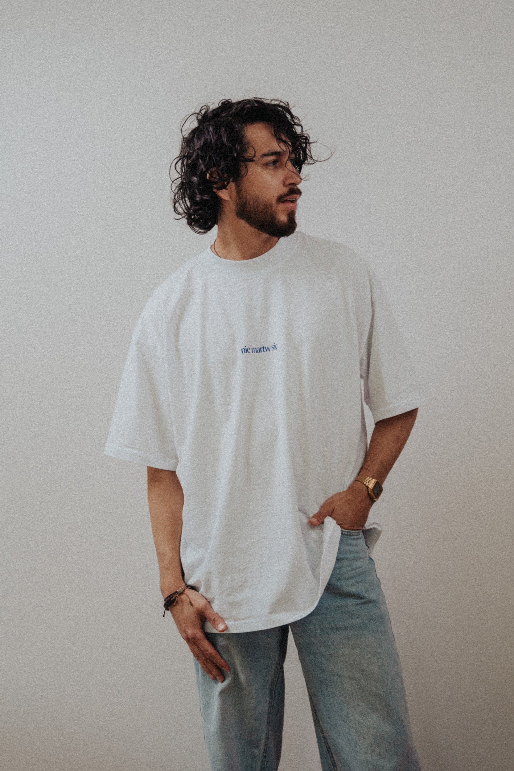 White organic cotton T-shirt with a soft, lightweight finish. Loose, relaxed fit with dropped shoulders. Blue print: small on the front, larger on the back.