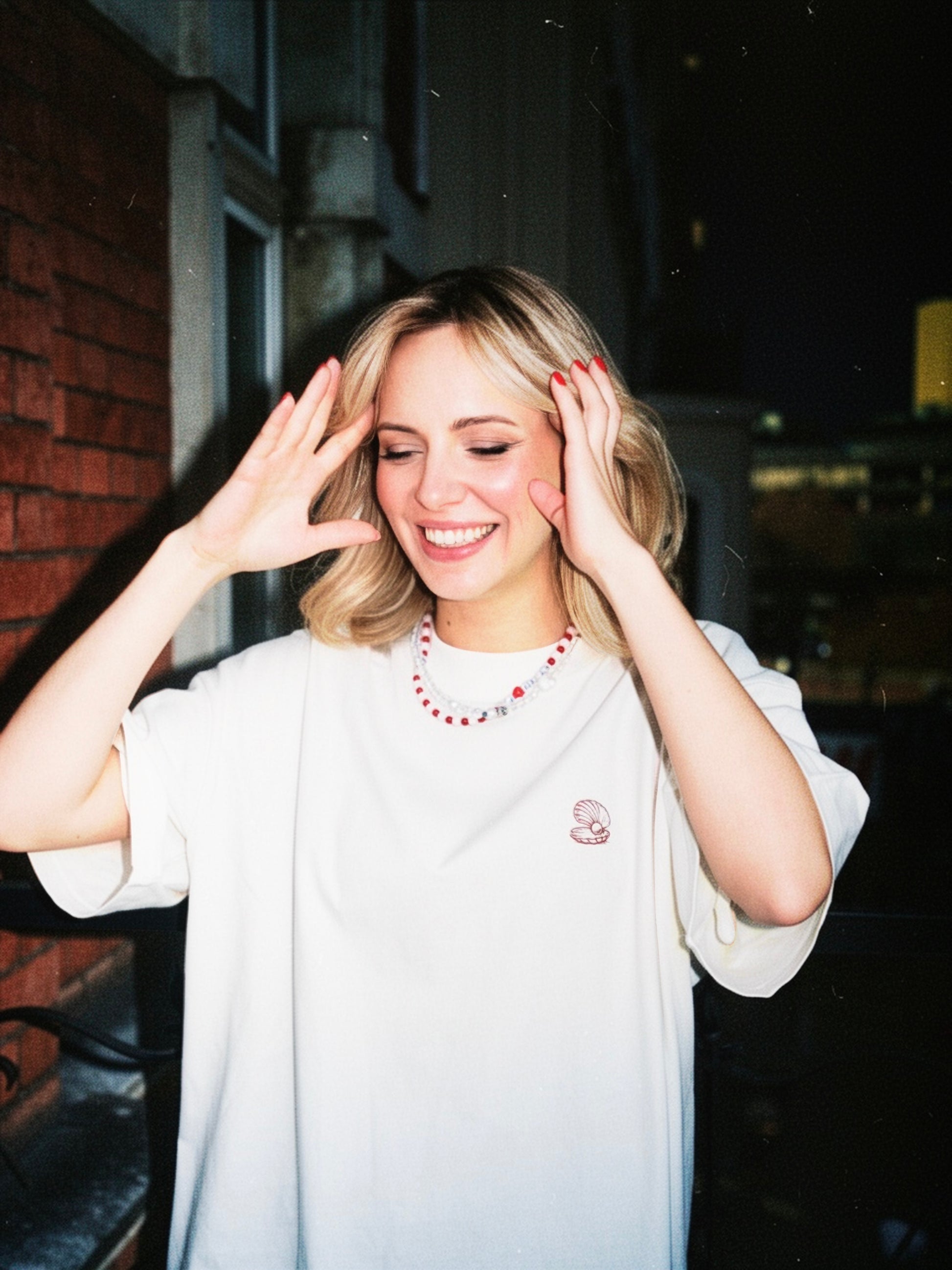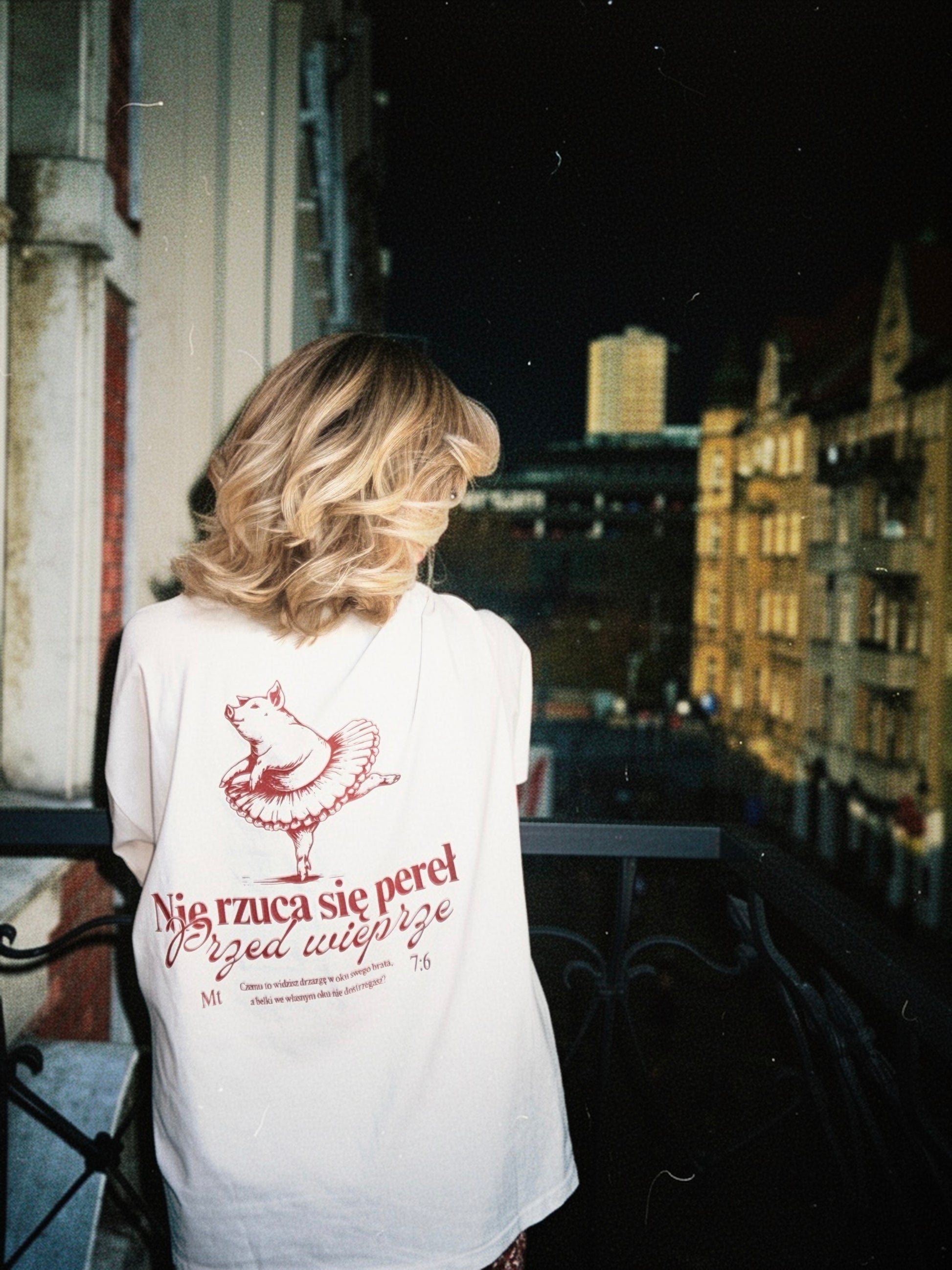 Koszulka z kremowej bawełny organicznej o miękkim, lekkim wykończeniu. Luźny, swobodny krój z obniżoną linią ramion. Nadruk w kolorze ciemnoczerwonym: subtelny z przodu, większy z tyłu.